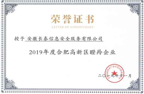 2019年,11月20日,合肥高新区2019年高成长企业榜单正式发布,高新区共认定了502家高成长企业,其中雏鹰企业275家、瞪羚培育企业72家、瞪羚企业149家、潜在独角兽企业3家、独角兽企业1家、平台型龙头企业2家。作为其中的高科技企业——安徽乐竞体育在线官网首页-乐竞(中国)成功入选瞪羚企业榜单。